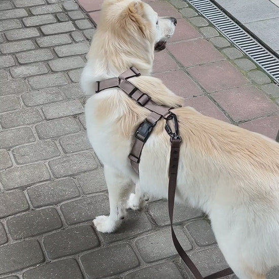 The harness has six adjustment points, which allows you to achieve a perfect fit. It is conveniently put on over the dog's head - there is no need, for example, to lift the animal's paws. It is possible to order additionally - a ring on the chest (for dogs who pull the leash too much), additional fastexes on the neck (for those dogs who do not like to put the harness on over their head) and also a third additional strap.