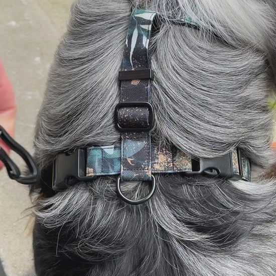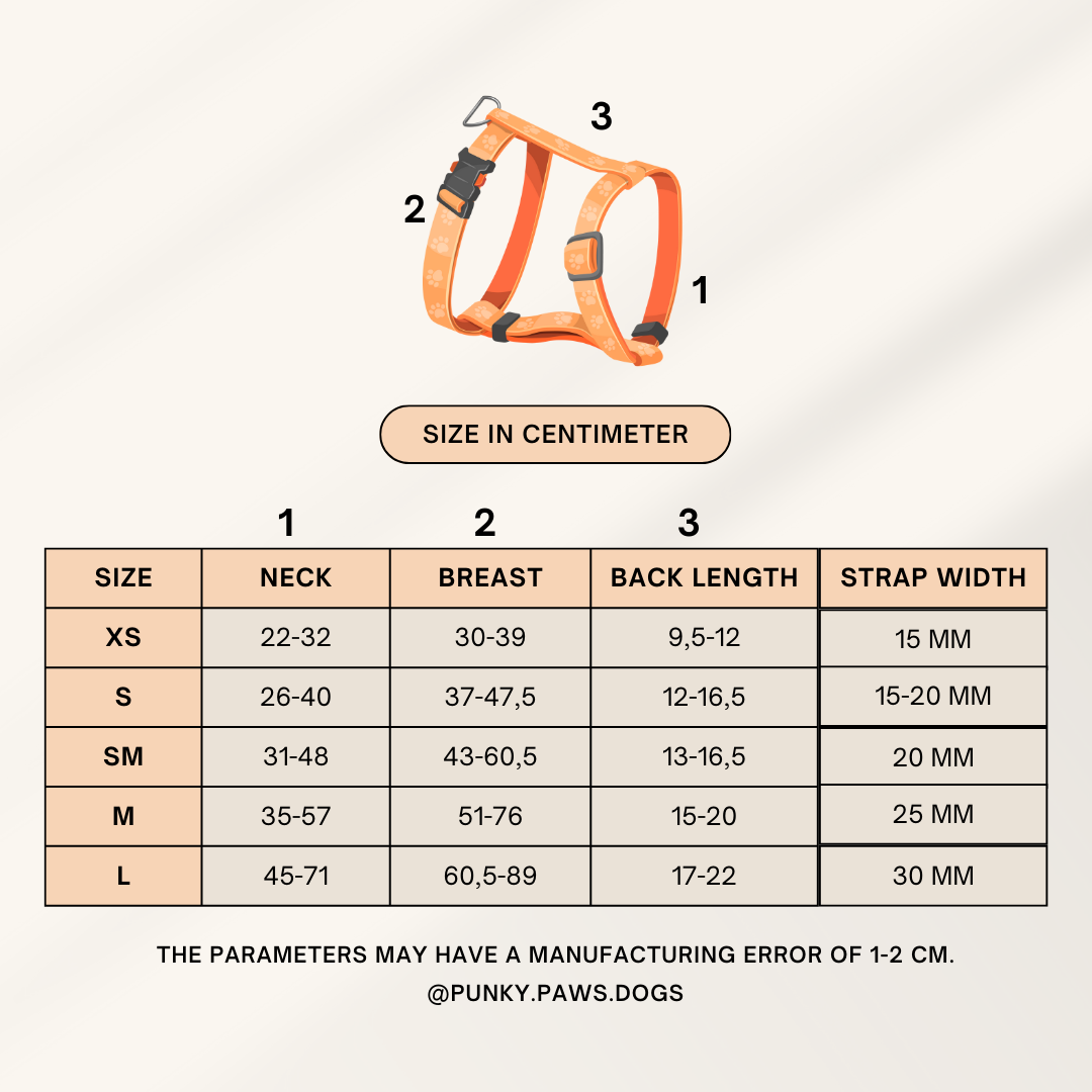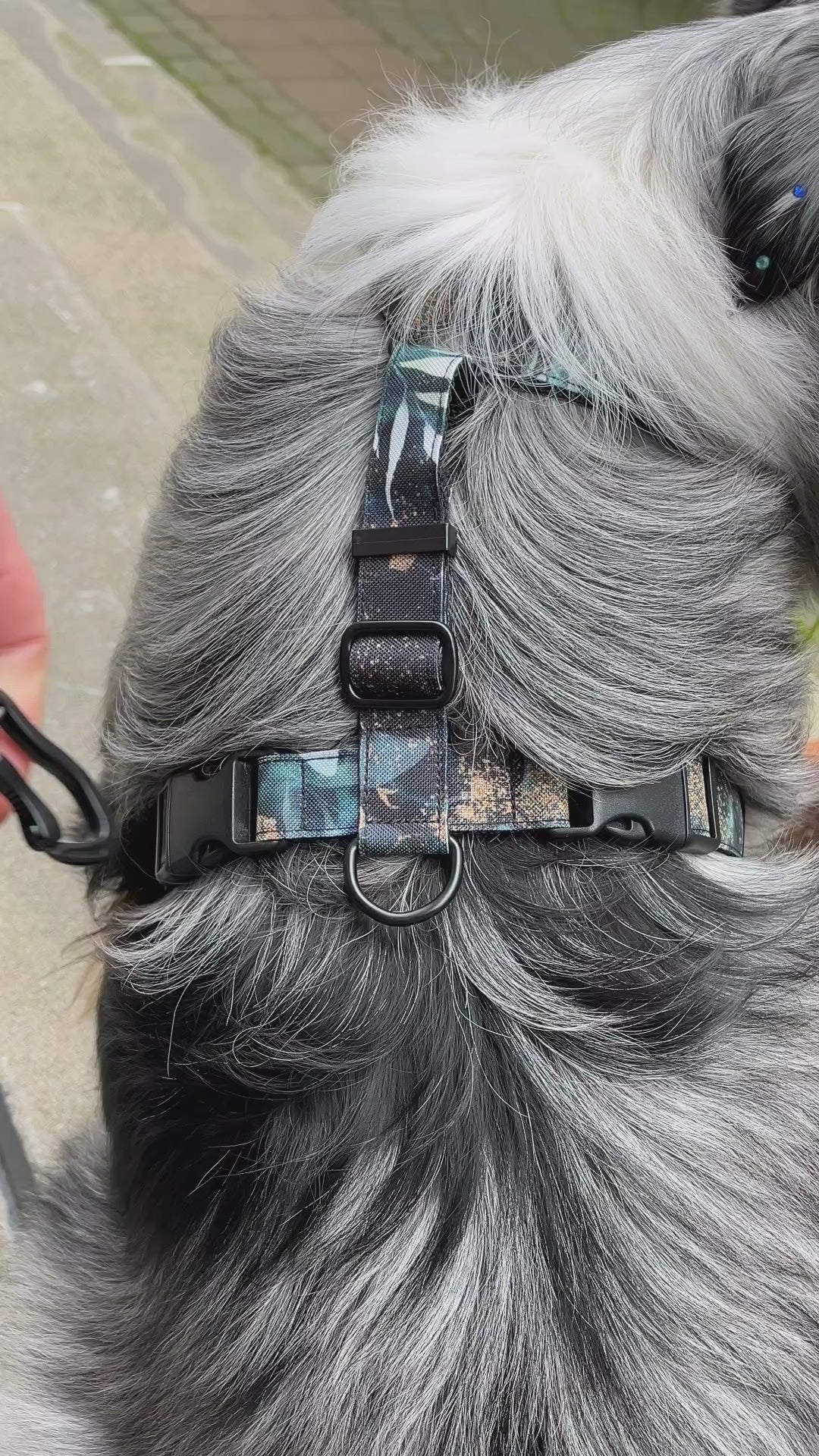 The harness has six adjustment points, which allows you to achieve a perfect fit. It is conveniently put on over the dog's head - there is no need, for example, to lift the animal's paws. It is possible to order additionally - a ring on the chest (for dogs who pull the leash too much), additional fastexes on the neck (for those dogs who do not like to put the harness on over their head) and also a third additional strap.