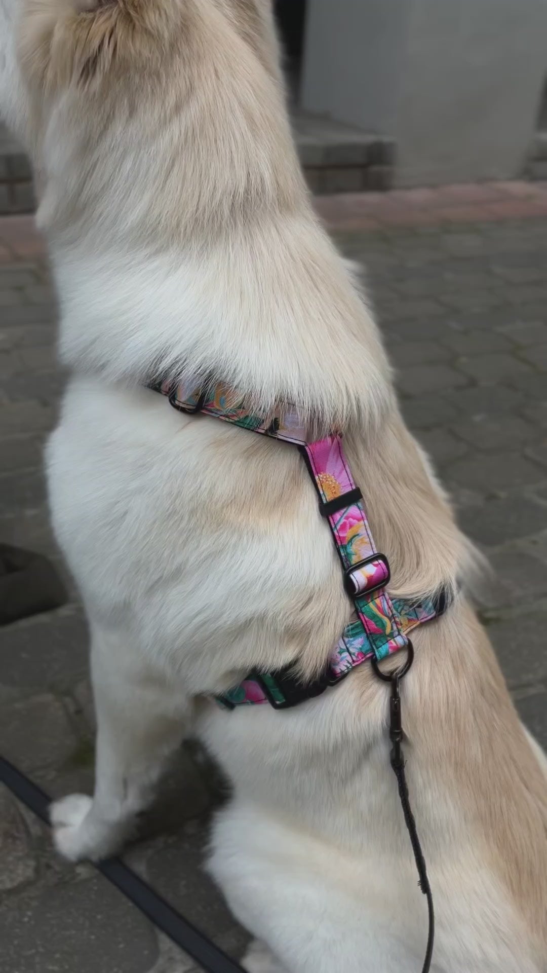The harness has six adjustment points, which allows you to achieve a perfect fit. It is conveniently put on over the dog's head - there is no need, for example, to lift the animal's paws. It is possible to order additionally - a ring on the chest (for dogs who pull the leash too much), additional fastexes on the neck (for those dogs who do not like to put the harness on over their head) and also a third additional strap.