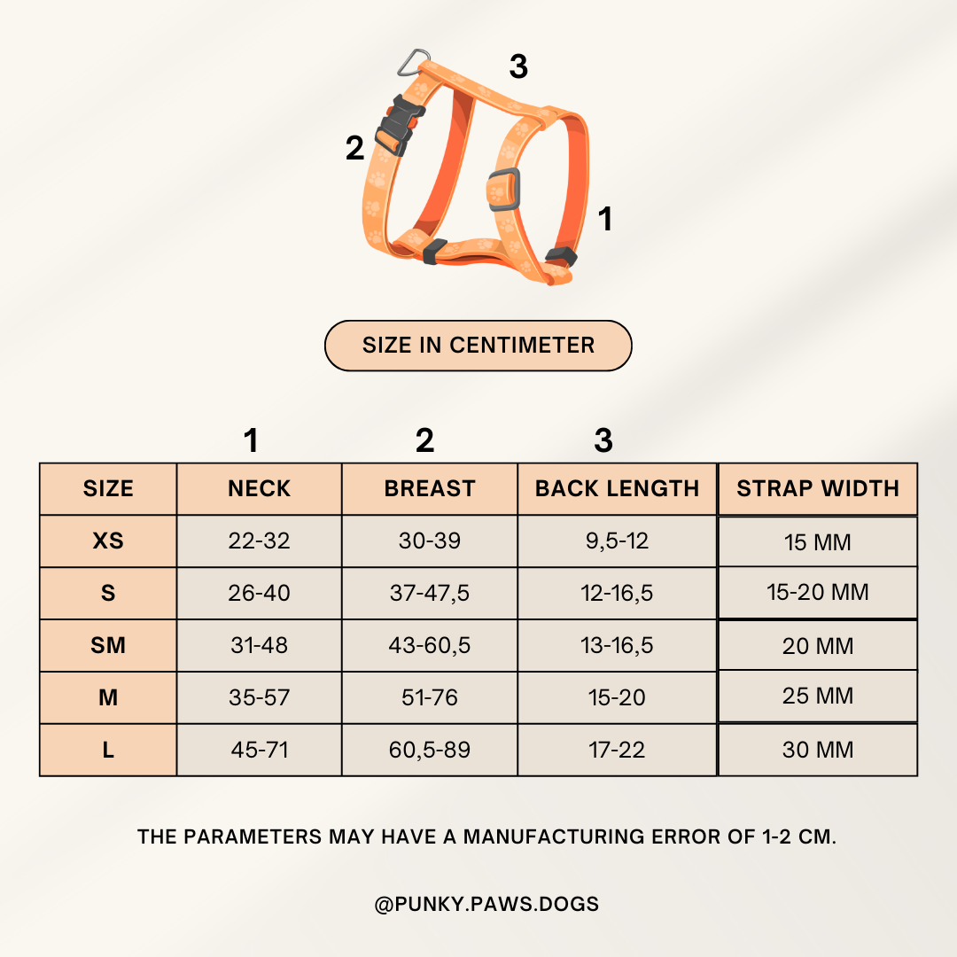 The harness has six adjustment points, which allows you to achieve a perfect fit. It is conveniently put on over the dog's head - there is no need, for example, to lift the animal's paws. It is possible to order additionally - a ring on the chest (for dogs who pull the leash too much), additional fastexes on the neck (for those dogs who do not like to put the harness on over their head) and also a third additional strap.